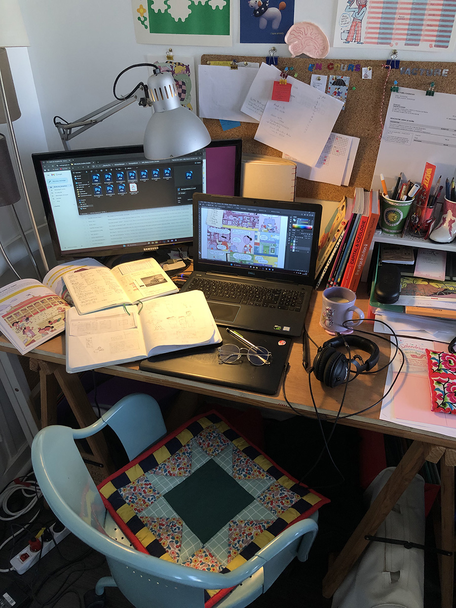 Je travaille de chez moi, sur mon bureau dans mon salon, avec beaucoup de musique quand je dessine et beaucoup de silence quand je storyboard. Ah et du thé, toujours. Et parfois mon assistant (mon copain), lorsqu’il est en télétravail.