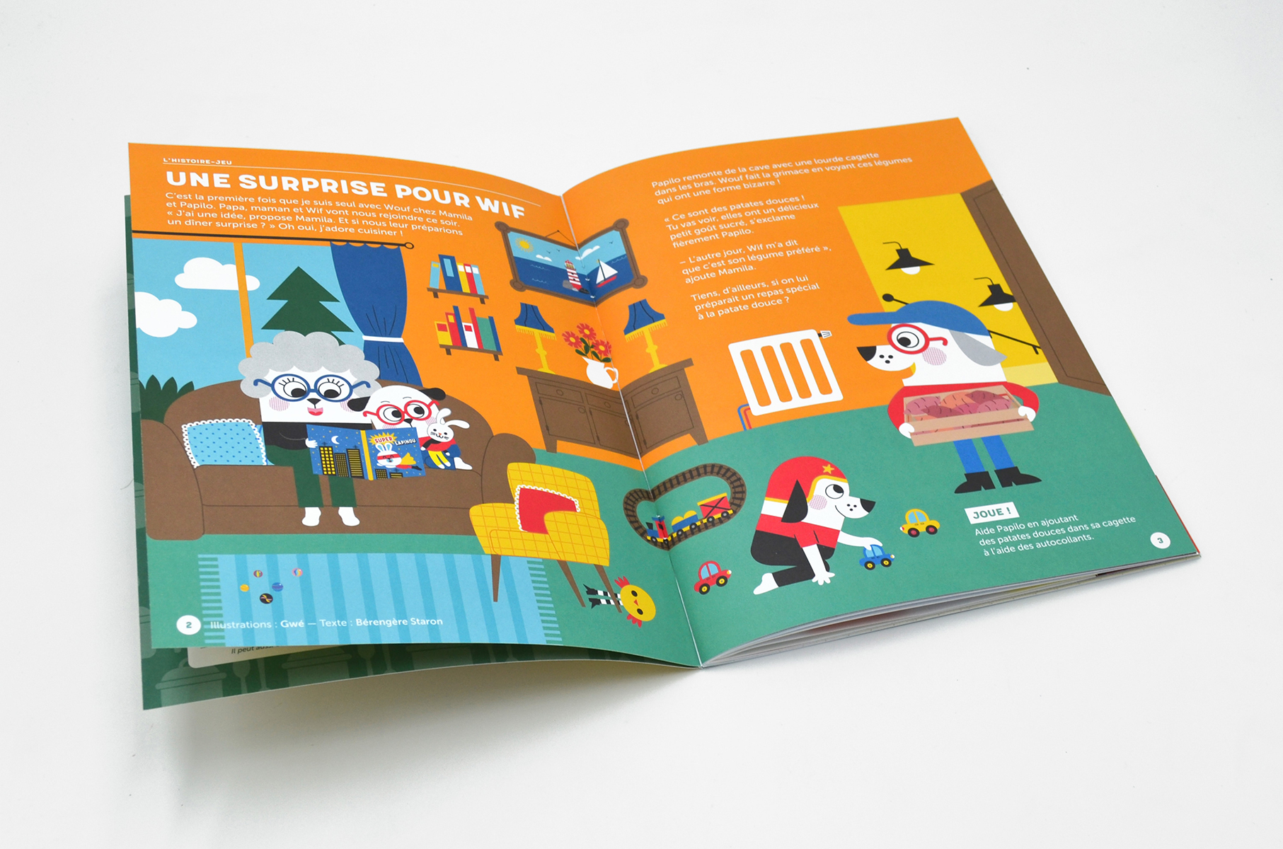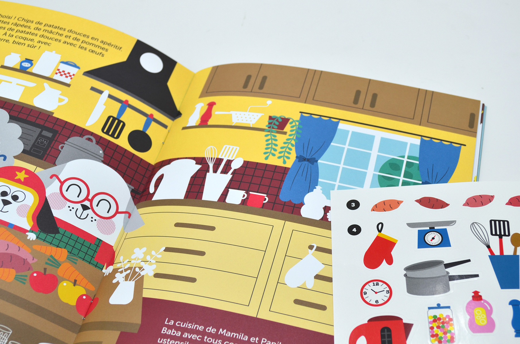 - Dans l’histoire-jeu, on cuisine un menu complet autour de la patate douce et on s’amuse à nommer tous les ustensiles d’une cuisine… en même temps qu’on colle les autocollants.