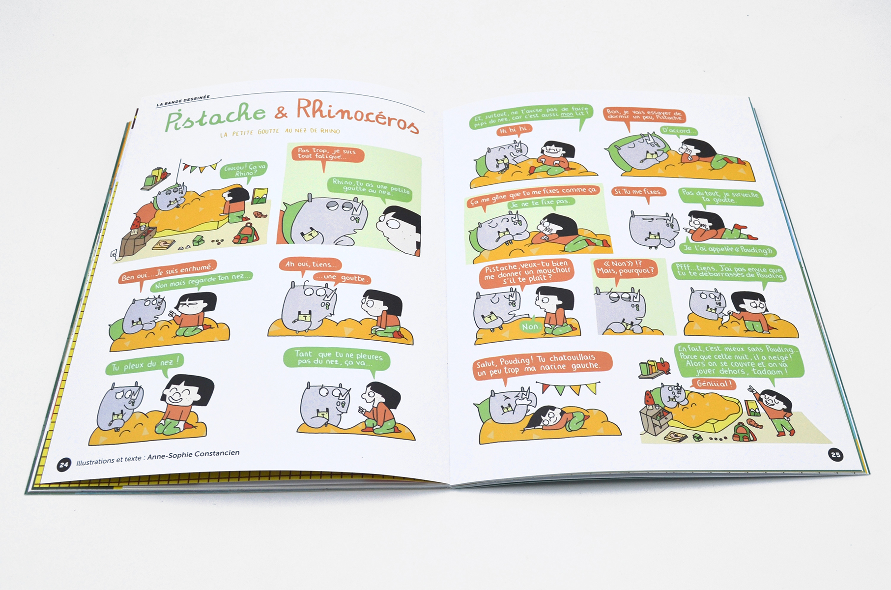 - Dans la nouvelle BD de Pistache et Rhino, Pistache se prend d’amitié… pour une petite goutte qui pend au nez de Rhinocéros.